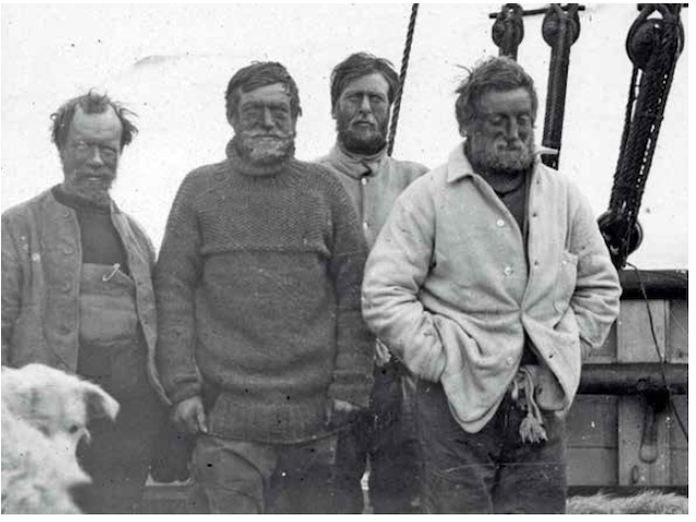 It was three months since Shackleton had left with his small crew on the James Caird. "We tried to cheer but excitement had gripped our vocal cords. Marston rushed for the flagstaff, ... but the running gear would not work and the flag was frozen into solid compact mass, so he tied his jersey to the top of the pole for a signal. The ship stopped... and we were able to recognise Shackleton. We gave a cheer with more feelings from the heart that I can express words. We said to each other, 'Thank God, the Boss is safe'."