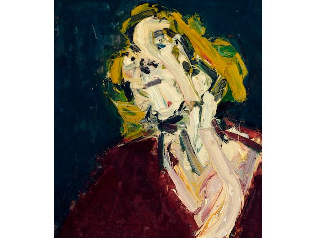 The first of Brown's seven recycled versions of Auerbach's painting came in 1991. Brown, who was then studying in London at Goldsmiths College, called it Atom Age Vampire, a reference to an Italian film about a woman whose appearance is altered after a car crash. This was followed by other pictures by Brown derived from the same Auerbach painting: KinderTransport (1999), New Dawn Fades, The Marquess of Breadalbane, Kill the Poor, The Real Thing and the painting to be offered at Bonhams, Little Death (all from 2000). One of the striking points about this group is that, though all of the works are visibly related to Auerbach's original, they are all different, in colour, composition, backdrop, and even the shape of the support (The Marquess of Breadalbane is a baroque oval). The tilt of J.Y.M.'s head morphs from picture to picture, as does the colourway in which she is painted; in New Dawn Fades, the figure is made up of blue and green brush strokes, whilst in Kinder Transport it is marbled purple-yellow ones. In Little Death, however, J.Y.M is silhouetted against distant mountains and airy sky, quite unlike the solid wall of paint in the Auerbach. The effect is reminiscent of the most famous portrait of all, the Mona Lisa.